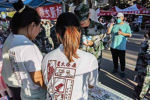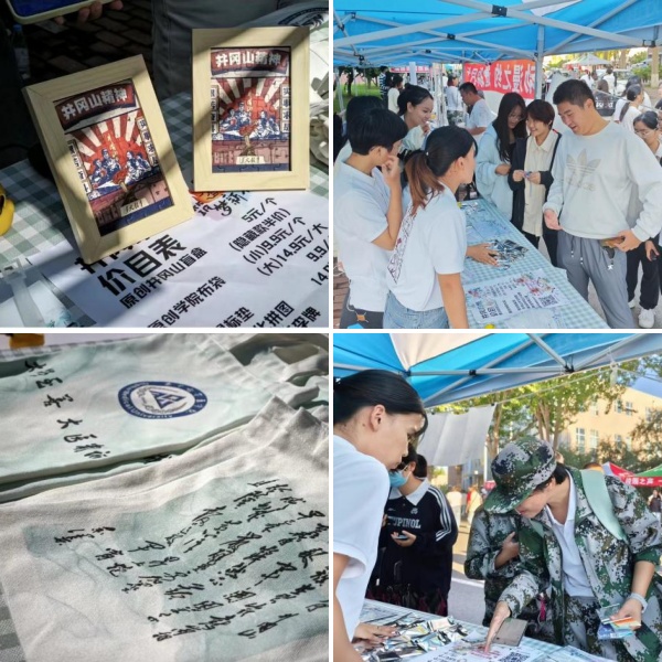 创意市集中,来自病理学院的“筑梦新时代,青春正当燃”青年志愿宣讲团成员们,结合暑期井冈山社会实践的所见、所闻、所感,在研学中用画笔实时记录下井冈山的一草一木、一人一事,并设计制作了钥匙链、胸章、口罩、行李牌、鼠标垫、拼图和手提帆布包等原创设计文创产品。
