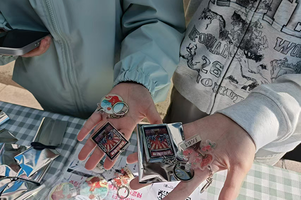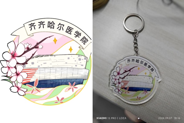 药学院创意市集摊位的挂件图案灵感来源于校园春景,以青春活力为主题,图案主体选用齐齐哈尔医学院体育馆,彰显学生的青春活力,边缘饰有校园春季花卉——杏花,底部为绿色浪潮,体现新时代齐医青年的生机勃勃。摊主说:“我曾在学校食堂旁被杏园满园的杏花惊艳,那一瞬的美丽在脑中挥之不去,于是,这次创意市集,我便选择了杏花,以春天的校园为背景,设计了这个亚克力材质的钥匙扣。”