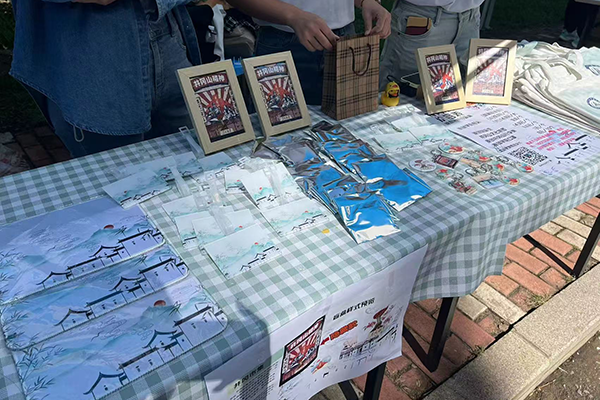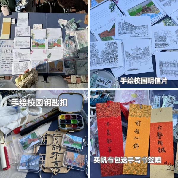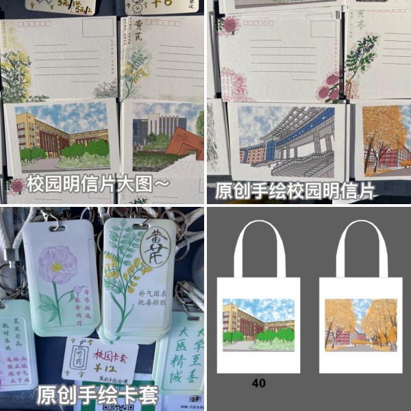药学院第6号摊位的摊主致力于践行《中医药文化传播行动实施方案(2021-2025)》提出的“中医药文化更广泛融入群众生产生活”的目标,注重从中医药题材进行文艺创作,讲好中医药故事。借助于校园内中草药种植基地,将校园文化与中草药智慧相融合,推出了本草校园系列文创产品,如明信片、校园卡套、笔袋、书签等,为校园内种植的中草药绘画了一份身份ID,增强校园文化认同感。明信片正面为手绘电子版的校园标志性建筑及风景,背面以手绘的校园内种植的芍药、黄芪、柴胡等中草药图案和功效为点缀,并以齐医校训为落款,将其构成校园记忆的缩影和中草药知识的美好载体。摊主罗洁同学感慨:“通过此次创意市集活动,我们看到了同学们对中草药的兴趣和对校园景观的热爱,通过创作这些文创产品,我们的创意和创造力得到激发与满足,这不仅是一次售卖购物体验,更是一次文化教育的旅程,期待未来能有更多这样的活动,为校园生活增添色彩,展现校园文化,传播中草药知识。”