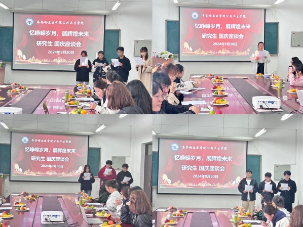 今逢喜诞,举国欢庆,为热烈庆祝新中国成立75周年,深入学习习近平新时代中国特色社会主义思想,弘扬爱国主义精神,公共卫生学院于9月30日在部系楼B-304举办以“忆峥嵘岁月 展辉煌未来”为主题的研究生国庆座谈会。公共卫生学院白丽副院长、研究生管理科教师和全体研究生参加了本次座谈会。
