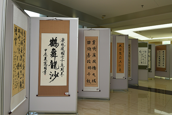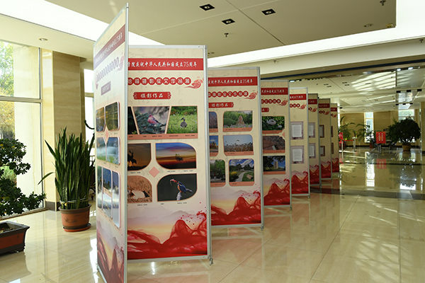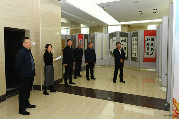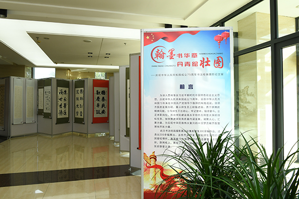 为庆祝中华人民共和国成立75周年,深入学习贯彻习近平新时代中国特色社会主义思想,展现师生昂扬向上的精神风貌,9月29日,由学院工会主办,团委、离退休工作处协办的“翰墨书华章·丹青绘壮图”庆祝中华人民共和国成立75周年书法绘画摄影征文展在图书行政楼一楼大厅展出。学院领导顾长虹、赵光、张可勇、史耀忠、李龙珠、于海涛与师生一起观看展览。