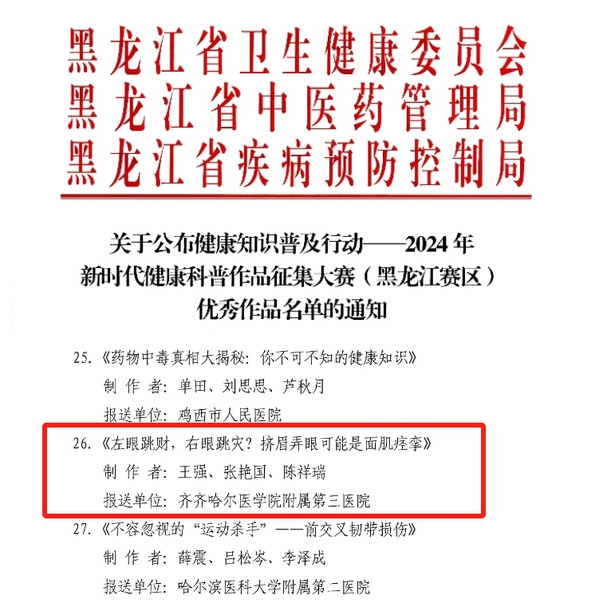 近日,大赛黑龙江赛区优秀作品名单公布,由我院神经外一科主任张艳国、副主任陈祥瑞、医生王强创作的视频类作品《左眼跳财,右眼跳灾?挤眉弄眼可能是面肌痉》获评黑龙江赛区优秀作品。