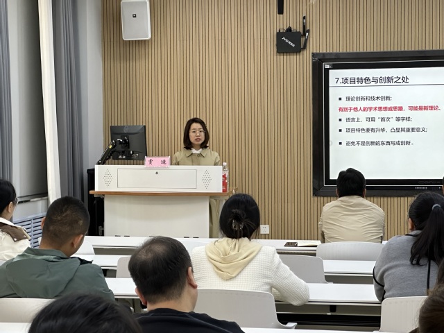 贾迪教授以“国家自然科学基金项目申报经验交流”为题,从2024年国家自然科学基金申报情况介绍、国自然如何进行选题、国自然标书撰写注意事项三个方面,对如何准备和撰写一本高质量的申请书进行了全面深入细致的介绍。贾老师通过自己三年来的申报历程的分享,鼓励申报教师一定要尽早准备,不因一时的得失而自我否定,要做好长期规划,打牢前期基础。此次分享为我院青年教师提供了宝贵的参考和借鉴。
