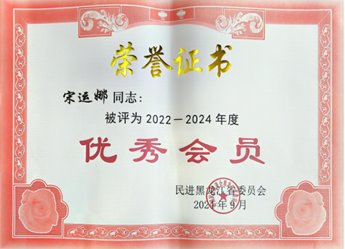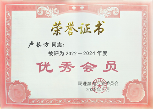 近日,民进齐齐哈尔医学院支部主委卢长方、副主委宋运娜被民进黑龙江省委员会授予2022-2024年度“优秀会员”荣誉称号。