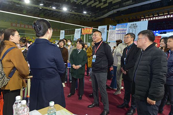 学院党委副书记张可勇深入招聘会现场指导就业工作,与用人单位和毕业生充分交流沟通,询问用人单位在我校的招聘用人情况、现有毕业生工作情况、对毕业生的用人满意度、用人单位当地政府的人才引进优惠政策、薪资待遇等,希望用人单位对我校的教育教学和学生培养提出宝贵意见,鼓励同学们多与用人单位交流,充分展示自我,找到称心如意的工作。同时,他对招生就业处及各二级单位就业工作人员提出了具体的工作要求,要求大家广开就业渠道,丰富招聘会开展形式,充分搭建就业服务平台,按照省、市分区域建立与用人单位的联系数据库,打造招聘团效应;要积极开展“直播带岗”活动,为不能到场的用人单位和毕业生开拓直播推介新模式,为学校毕业生高质量充分就业做好保障;要求各二级单位要结合学校“十四五”重点工作及医科大学建设总体规划,认清形势,明确目标,多措并举,全员参与,以更高水平的指导服务和更加有效的工作举措,扎实推进就业工作。