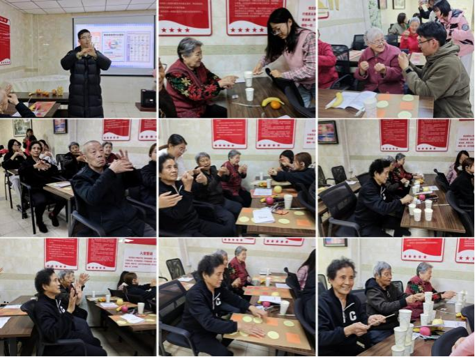 在糖尿病科普结束后,志愿者们开展了手指操教学,增强老年人的手脑协调性,促进血液循环,改善大脑功能,对预防糖尿病并发症具有积极意义。随后,志愿者们组织了“左手方右手圆”和“杯子叠叠乐”小游戏,通过简单的活动锻炼老年人的手脑协调能力和反应速度,并在游戏中增进老人之间及老人和志愿者之间的情感交流。