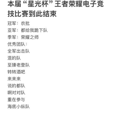王者荣耀这款电竞游戏,每一场比赛有两支队伍进行比拼,每一支队伍有5名队员,率先攻破敌方水晶即为胜利。在比赛过程中不仅能考验选手们的决策和随机应变能力,更能体现团队合作精神。经过多轮激烈的比拼,最终“农批队”凭借卓越的战术布局和团队协作,成功夺得冠军宝座,亚军则由“都给我跪下队”摘得,季军则由“荣耀之师”队获得。此外,还有九支队伍荣获了优秀团队奖。