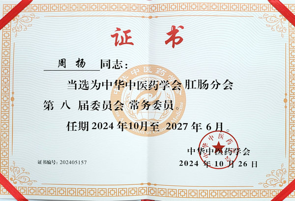 本次大会主题是“打造肛肠新质生产力,助力中医优势专科建设” 。会议内容包括本学科的国内外最新研究进展、诊疗方案及疑难点、典型病例交流;中医药防治肛肠疾病的新进展;增补肛肠分会第八届委员会青年委员、委员、常务委员、副主任委员等,周扬主任凭借扎实的临床功底、丰富的诊疗经验与高超诊疗技术,通过大会层层选拔推荐,光荣当选常务委员。