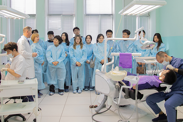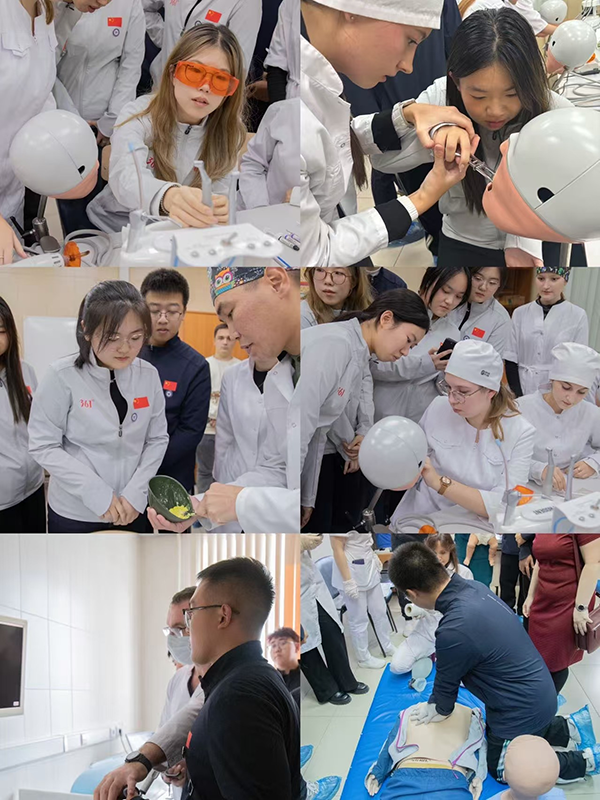 交流期间,代表团在俄罗斯赤塔国立医学院领导和老师的陪同下,参观了赤塔国立医学院附属口腔医院牙科诊所、模拟中心、解剖馆及生物学馆。学生们认真观摩了常见口腔治疗的详细操作流程、3D打印牙齿模型和急诊急救操作技能等多种口腔疾病诊疗过程。口腔医院还特意为学院口腔医学专业学生安排了半日的临床实践活动,同学们积极参与操作,更直观地体验了国际前沿口腔医疗实践。