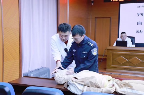 战东宇以《守护健康,从“心”开始》为题,结合自己的临床经验,围绕“高血压健康知识、冠心病健康知识、如何预防猝死的发生、初级心肺复苏”四个方面,将专业的医学术语用通俗易懂的语言为大家讲解了高血压及冠心病的病因及防治知识,并利用模拟人讲解操作心肺复苏的具体步骤以及相关注意事项。战医生的授课深入浅出,具有很强的指导性和操作性。经过理论知识和观摩演示后,在医生的指导下,民辅警积极上台实践操作,模拟不同情境下如何快速、正确地运用心肺复苏术实施紧急救助,在实操中进一步加深对心肺复苏这一急救技能的掌握。