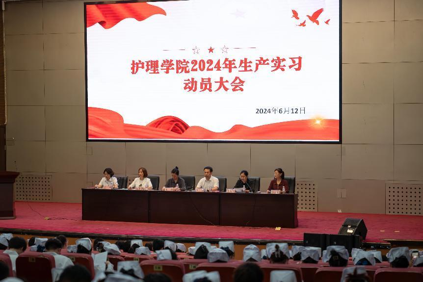 为保证学生明确实习目的、端正实习态度、更好地完成实习任务,6月12日下午,护理学院组织召开2024年生产实习动员大会。护理学院党总支书记李强、院长高音、党总支副书记付桂华、副院长李桂玲、马秀梅、学生工作办公室主任王坤及2021级全体实习学生和辅导员参加会议。大会由护理学院党总支副书记付桂华主持。