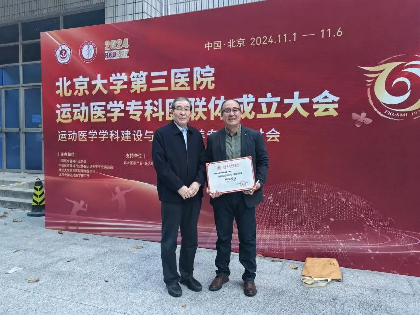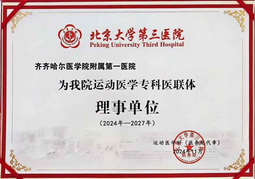 为积极响应国家深化医疗改革号召,推动医疗资源优化配置,11月1日,北京大学第三医院运动医学专科医联体成立大会在北京大学医学部会议中心召开。会上,齐齐哈尔医学院附属第一医院被正式授予北京大学第三医院运动医学专科医联体理事单位,我院骨外科四病区王雪峰主任出席会议并接受授牌。