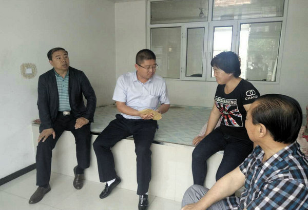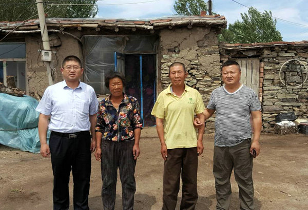 周扬主任(左一)与龙江县山泉镇河心村党支部书记看望村重点帮扶户王成仁夫妇