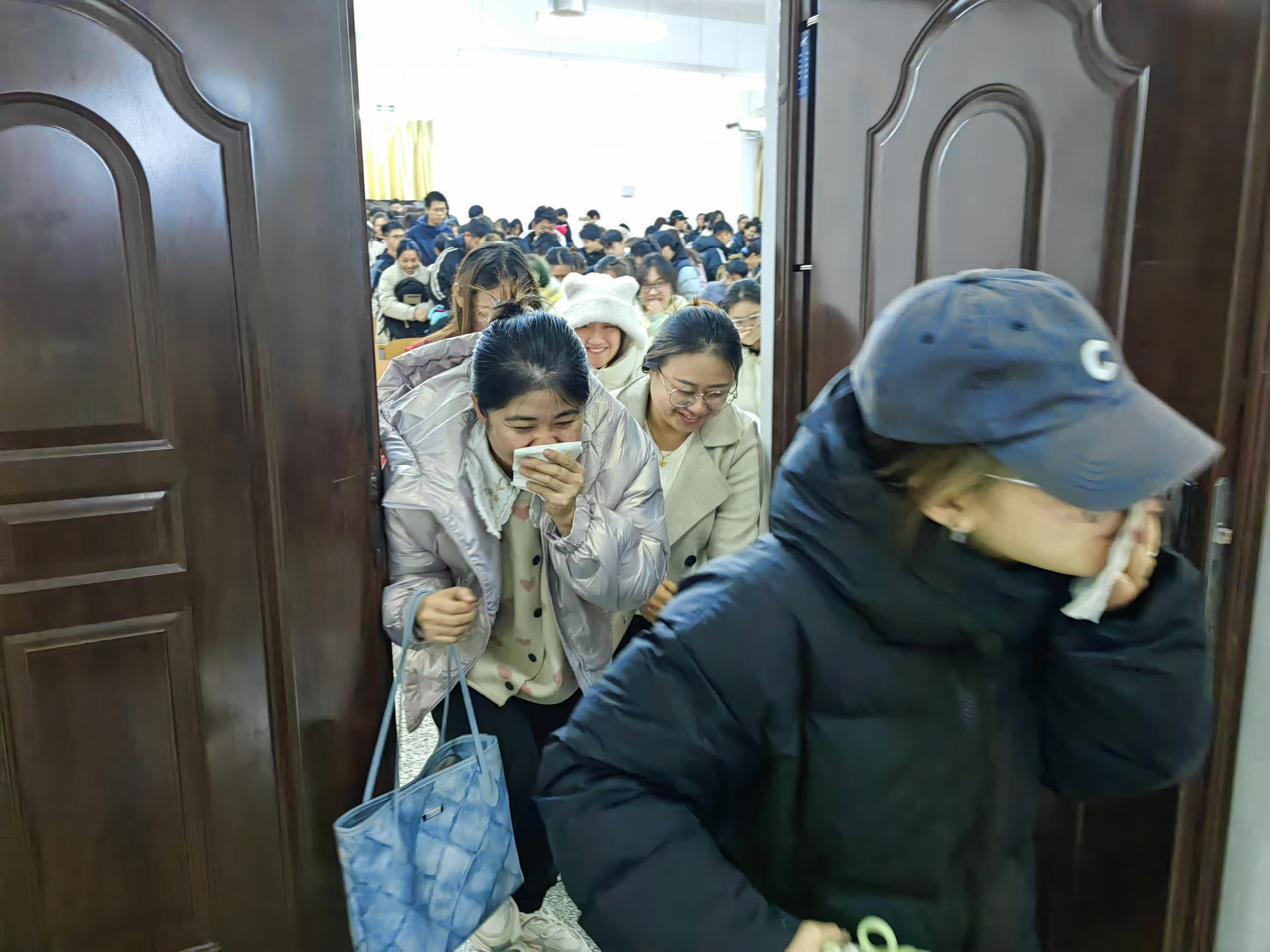 讲座结束后,随着警报声响起,与会师生模拟火灾现场开展应急逃生演练,大家在冯福军教官的指示下用湿毛巾捂住口鼻,压低身体,弯腰小步快走,有序地从消防通道撤离。