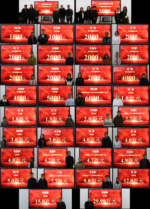 会议中,韩翠艳宣读了奖励名单,受奖励的教师逐一闪亮上台,记录璀璨瞬间。2024年,药学院在教学科研工作方面取得了显著成绩,20人及2个教学团队荣获教学奖励,22人荣获科研奖励,奖励的总金额为124.59万元,其中科研奖励金额为118.79万元。韩翠艳对药学院教职工所取得的成绩给予了充分肯定,对他们通过辛勤努力为学校和药学院发展所做的贡献表示感谢,同时对教职工未来再创佳绩寄予了殷切期望。此次奖励总结大会在热烈而又温馨的氛围中圆满落幕。