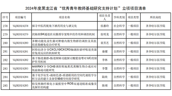 近日,黑龙江省教育厅公布了2024年度黑龙江省“优秀青年教师基础研究支持计划”立项名单,学院7名教师获批自然科学一般项目立项,1名教师获批社会科学一般项目立项。