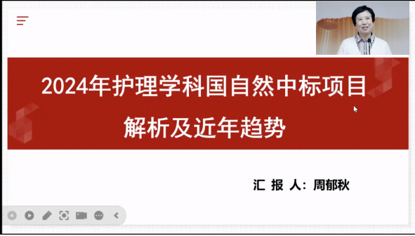 周郁秋教授以《2024年护理学科国自然中标项目解析及近年趋势》为题,从2024年护理学科国自然立项概况、护理学科国自然研究设计解析、护理学科国自然研究的热点及趋势三个方面,分析了当前护理科研的发展趋势,并结合自身多年国家自然科学基金研究经历,对2024年国自然中标课题进行了创新性解读,对护理科研的基本步骤、提高项目申报成功率的关键技巧等内容进行了详细阐述和经验分享。周郁秋教授强调,国自然项目对于教师自身发展、学科发展以及学院发展均有着至关重要的意义,全体师生要有坚定的决心,持续挖掘自身潜力,勇攀科研高峰。