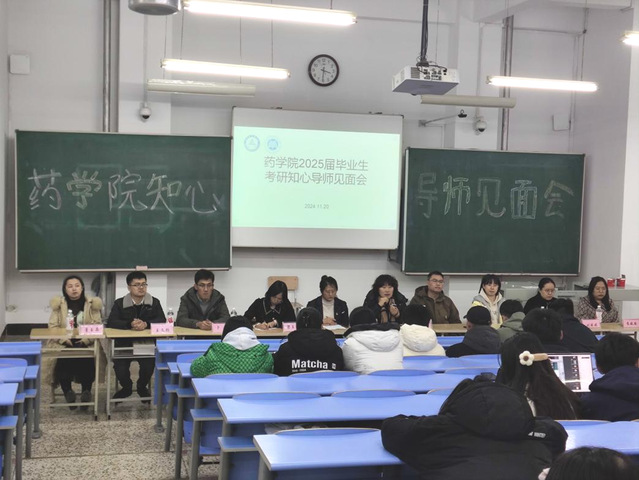 2024年11月20日下午,药学院2025届毕业生考研知心导师见面会在北区114召开。药学院副院长崔红霞、药物制剂方向知心导师朱文全、药物分析及其他方向知心导师刘婷婷、药物化学方向知心导师卜明、药理学方向知心导师韩翠翠、中药学方向知心导师王文豹、临床药学方向知心导师袁晓安、学工办主任梁玉清、辅导员董玉晶及2025届全体报考研究生的同学参加了此次见面会。见面会由药学院党委副书记孔寰宇主持。