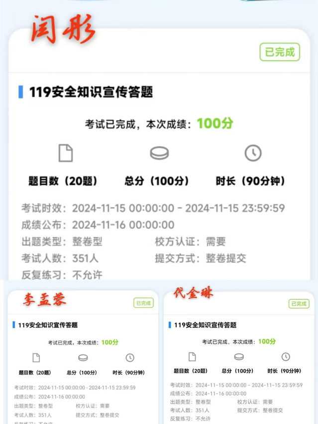 此外,我院还通过易班APP开展了“119消防知识线上答题活动”,设置了一系列消防安全相关的问答题目,同学们答题平均分均达95分以上。这项活动不仅增强了学生的参与感,还有效地促进了消防知识的传播,让消防安全意识深深扎根于每位学生的心中。