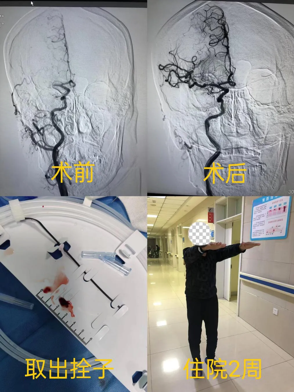 14:10到达导管室,14:35穿刺成功,15:10血管再通。历时1小时的忙碌,在神经介入团队及导管室全体医护人员的紧密配合下,用最快的速度开通了闭塞的血管,术后2小时患者意识清醒,瘫痪侧肢体能自主活动,次日,患者搀扶下能行走,2周后出院时陈大爷精神矍铄,肢体力量基本恢复正常,生活如同常人。家属说:在齐医附属第一医院神经介入病区能得到这么及时的救治、并且恢复的这么好,真是太感谢了。