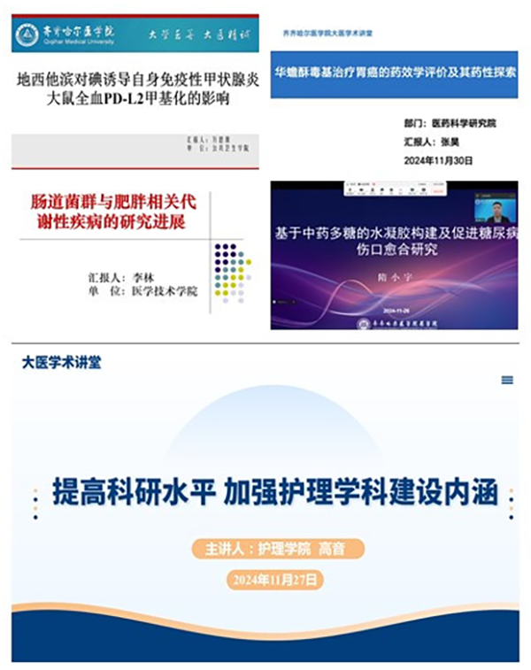 按照学院“大医学术讲堂”总体安排,11月,公共卫生学院、药学院、医学技术学院、护理学院、医药科学研究院的5名专家进行了精彩讲座。
