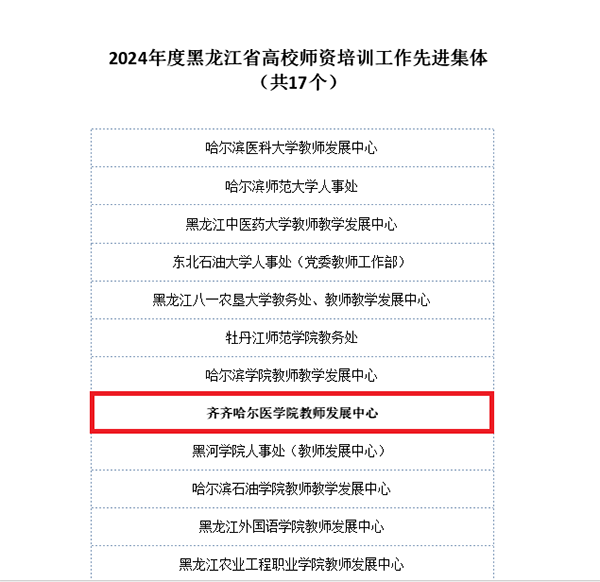 近日,由黑龙江省高校教师培训中心组织开展的省高校师资培训先进集体、先进个人评选工作结果揭晓,共有17个先进集体、27名先进个人获奖。学院教师发展中心荣获“2024年度黑龙江省高校师资培训工作先进集体”。