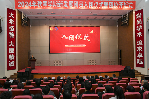 基础医学院党委书记潘洪明、精神卫生学院党总支书记杨泰、公共卫生学院党总支书记史孝志、医学技术学院党委书记孙贺、护理学院党总支书记李强、药学院党委书记丛凯、病理学院党总支书记李迎新、口腔医学院党总支书记姜鹏为新团员代表颁发团员证、佩戴团徽。全体团员面对团旗进行庄严宣誓,铿锵的誓词表达了团员青年为团组织增光添彩、为强国建设挺膺担当的豪迈情怀。新团员代表、口腔医学院宋炳辰同学,优秀团员代表、药学院李文杰同学先后发言。仪式在团歌《光荣啊,中国共青团》合唱中结束。