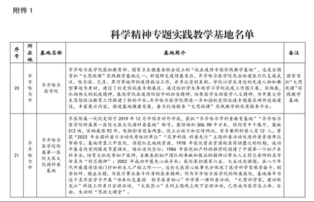 日前,省教育厅、省科技厅等11个部门联合发布《关于公布黑龙江省首批“大思政课”实践教学基地名单的通知》,学院“抗击疫情专题实践教学基地”和附属第一医院“大医文化园科普基地”入选科学精神专题实践教学基地。其中,学院“抗击疫情专题实践教学基地”为国家首批“大思政课”实践教学基地。