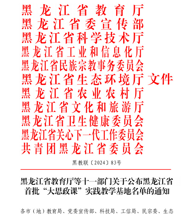 省教育厅等十一部门联合设立黑龙江首批“大思政课”实践教学基地,是深入贯彻落实习近平总书记关于学校思政课建设重要指示精神,落实全国、全省教育大会精神,充分调动全社会资源和力量,推动思政小课堂与社会大课堂深度融合,加快构建“大思政课”工作格局的重要步骤,是学校开展思政教育的重要载体和平台。