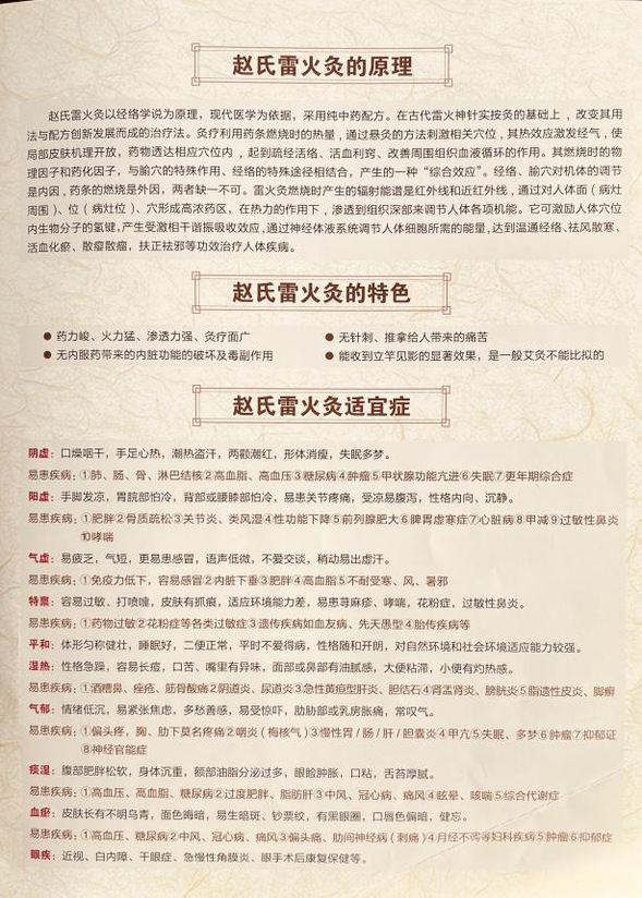 雷火灸不仅可用于治疗阳虚病证,对于实寒性质的病患亦可使用,即适用于治疗一切以阴寒性质为主的疾病。另外,雷火灸的适用性非常广泛,能治疗骨科、皮肤科、外科、内科、消化科、儿科等等各种疾病。
