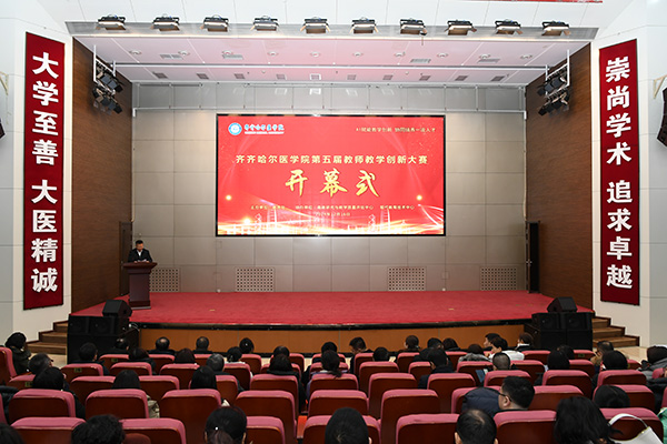 本次大赛由教务处主办,高教研究与教学质量评估中心、现代教育技术中心协办。组建了校内专家与校外专家相结合的大赛评委会,特别邀请哈尔滨医科大学胡丽红教授、陈慧楠教授、刘晶晶教授担任大赛创新汇报环节现场评审专家。学院本部教学单位院(部)长、分管教学副(部)院长,附属医院分管教学副院长,课程参赛选手、评委、无课教师、学生代表等150余人参加了开闭幕式。