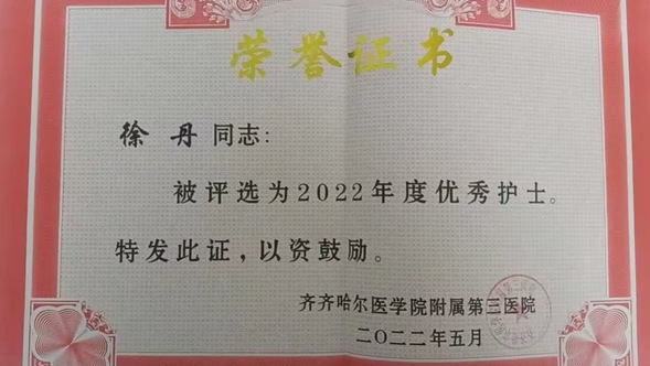 面对“三无”患者,徐丹彰显出“医者仁心、生命至上”的大爱精神。患者刘某(化名),没有亲人,经济也十分拮据,入院时全身浮肿,不能正常行走,只能靠轮椅出行。一天早上,刚刚值完夜班的徐丹正在与同事交班,看到刘某自行坐着轮椅要外出买早餐,徐丹考虑到患者出行不便,为防止出现意外,徐丹与同事交接好工作后,立刻下楼为患者买来了早饭,此后,每天早上徐丹都会第一时间将早饭买好送到病房。刘某对徐丹的感激之情不溢言表,刘某说道:“这么多年都是孤身一人,在这里却感受到了亲人般的温暖,让我觉得不再孤独。”