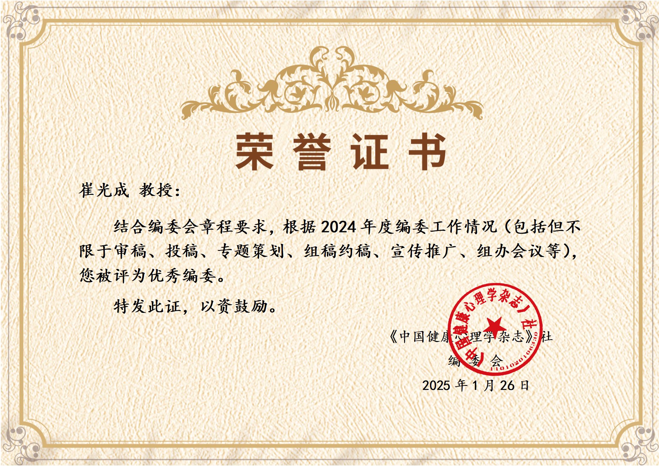 日前,《中国健康心理学杂志》社编委会根据2024年编委工作情况,结合审稿、投稿、专题策划、组稿约稿、宣传推广、组办会议等综合评议,将崔光成教授评选为优秀编委。