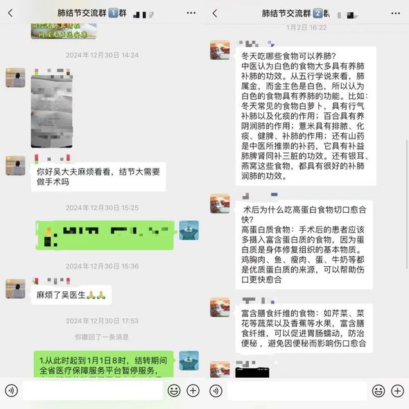 为加强医患沟通,胸心外二科医护团队专门创建了多个心胸外二科肺结节交流群,在群内有医护人员24小时为患者解答肺结节疾病相关的问题,介绍就医住院流程及手术预约事项,并定期开展健康宣教。