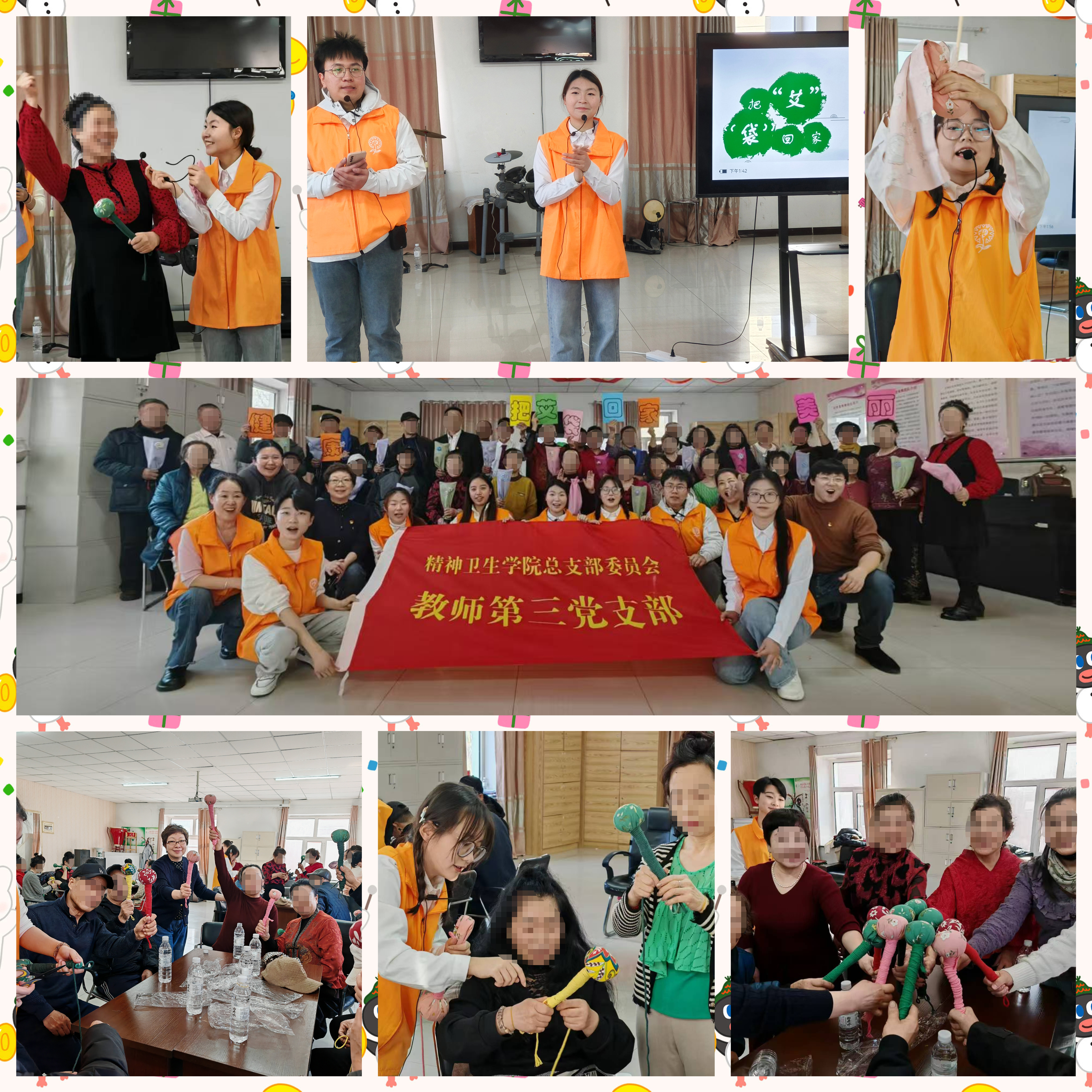 3月5日下午,在第62个雷锋纪念日来临之际,精神卫生学院教师三支部携手梅里斯区新时代文明实践中心一起走进胜利社区,带领社会工作专业师生团队组织开展了以《把“艾·袋”回家,健康你我他》为主题的、别开生面的社区活动。通过党建联动、专业服务,为近40名的社区老年人送去关爱与温暖,让他们享受一场丰富多彩的健康之旅。