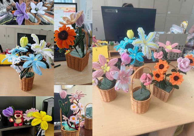 活动现场,五彩缤纷的扭扭棒、丝带、装饰珠、剪刀等材料整齐陈列。女教师们纷纷化身“花艺师”,通过“扭、绕、折”三部曲将这些材料塑造成花瓣、叶片,再以胶枪固定成枝,辅以珠饰点缀,最终形成了层次分明的花束。制作过程中,有的专注地调整花瓣弧度,力求逼真;有的大胆混搭色彩,以玫红配翠绿,碰撞出春日的盎然生机。