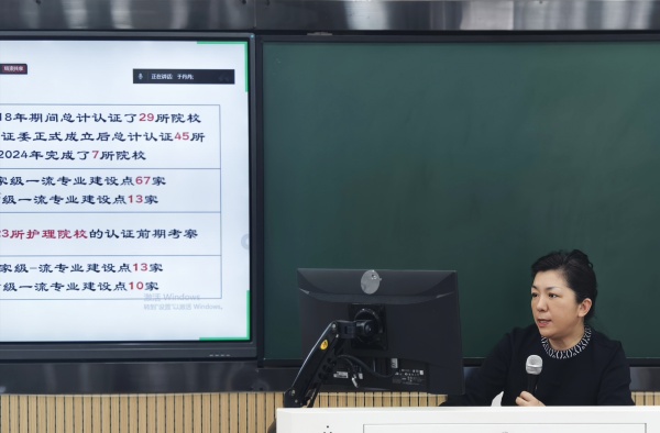 高音院长从护理学类本科专业办学总体情况、护理学专业认证发展历程、护理学专业三级认证的开展、护理学专业三级认证定量指标四个方面进行介绍,强调护理学专业三级认证对于提升护理教育质量、规范专业建设的重要意义。她指出定量指标体系作为认证过程中的关键依据,要详细解读每个指标的具体含义、衡量标准以及在认证中的权重,牢牢把握认证指标内涵和要求。最后,她从专业定位与培养目标出发,阐释如何通过精准量化的指标,确保培养目标与社会需求紧密贴合,使学生未来能在护理岗位精准发力。