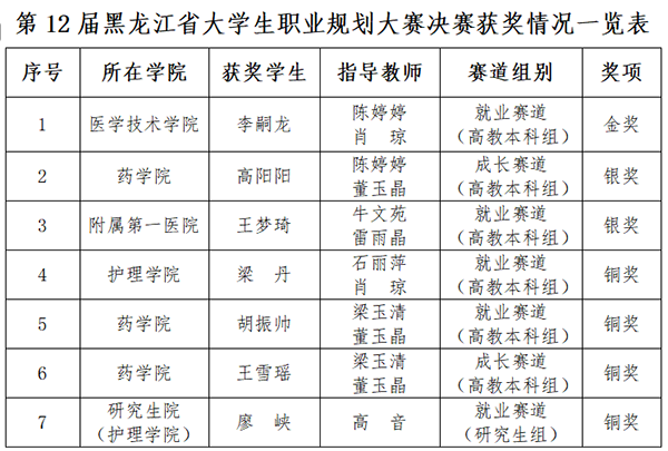 一直以来,学院坚决贯彻落实党中央、国务院和黑龙江省关于高校毕业生就业工作的决策部署,高度重视大学生职业规划和就业指导工作,将职业生涯教育深度融入人才培养全过程,全力促进毕业生高质量充分就业。此次大赛的优异成绩是学院育人成果的有力见证。学院将以此次大赛为契机,充分发挥“以赛促学、以赛促教、以赛促就”的积极作用,引导大学生树立正确的职业观、就业观和择业观,鼓励学生将个人发展与国家需要、社会发展紧密相连,在新时代的广阔天地中,以青春之我,筑强国之梦;凭规划之力,启未来新程,全方位提升学院人才培养质量,为社会输送更多优秀的医学人才。