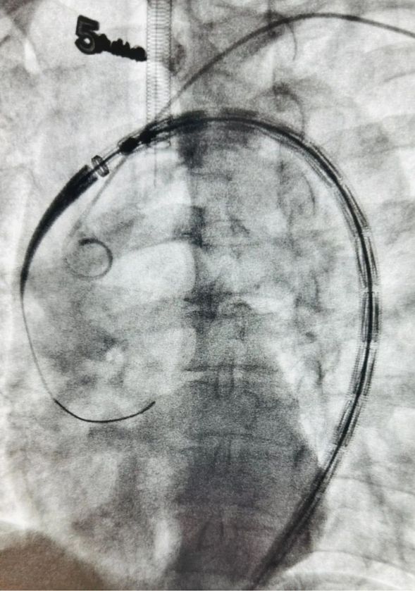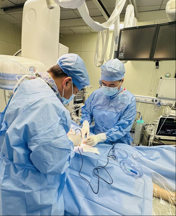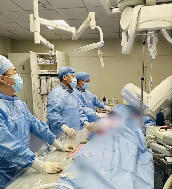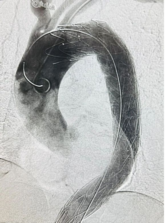 近日,患者张阿姨由于胸闷、胸痛且逐渐加重被紧急送到我院急诊。经主动脉CTA显示主动脉夹层形成,遂转入我院血管外科。由于患者发病时间较长,已错过72小时黄金手术期,动脉壁炎症水肿明显,急诊手术可能导致血管壁撕裂等严重并发症,血管外科赵明宇医生予以稳定血压,改善循环支持治疗,经过十多天医护团队及家属的协助配合,患者病情相对稳定。后对患者完善了相关检查,复查CTA,制定手术方案,通过多学科专家会诊评估手术风险,于2月25日行胸主动脉覆膜支架置入术,术后各项生命体征平稳,术后第三天患者已能正常下床行走。