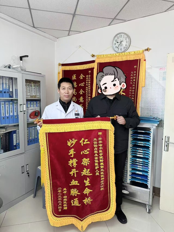 经神经内六科团队精准施治后康复出院的杨先生,专程将锦旗送至任占军主任手中。这面承载着患者深情的锦旗,不仅彰显着神经内六科团队以精湛医术解除病痛的职业素养,更诠释着现代医疗实践中不可或缺的人文温度。在任占军主任带领下,神经内六科医护团队将秉持精准治疗与暖心照护并重的诊疗理念,为群众百姓的生命健康保驾护航。