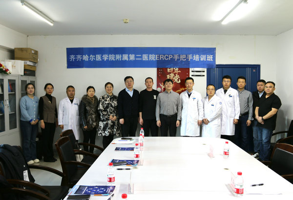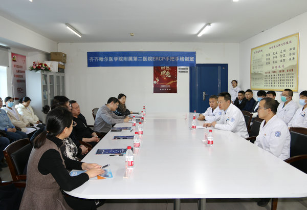 近日,齐医附属二院消化内科在临床技能中心306会议室成功举办ERCP手把手培训班,院长、党委副书记武立刚出席会议并致辞,腔镜室主任、消化内科二病区副主任(主持工作)范立君主持会议,会议邀请海军军医大学附属长海医院黄浩杰教授、吉林大学第一医院刘凯教授、哈尔滨医科大学附属第二医院赵磊教授、齐齐哈尔市第一医院许晶教授、齐齐哈尔中医医院朱晓东教授作培训交流,消化内科一病区主任王文斌及来自市域内各医院临床医生20余人参加会议。