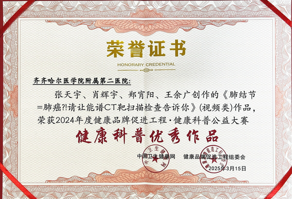 在健康科普公益大赛中,康复医学科胡斌、周志霞创作的图文类作品《青少年脊柱侧弯人体第二条生命线》、视频类作品《武林秘籍:12345 强筋健骨 —— 预防骨质疏松》,以生动的形式普及健康知识,荣获 “健康科普优秀作品”,影像中心张天宇、肖辉宇、郑宵阳、王余广创作的视频类作品《肺结节 = 肺癌?!请让能谱 CT 靶扫描检查告诉你》,以专业视角破解健康误区,荣获 “健康科普优秀作品”。这些作品融合科学性与通俗性,为公众健康知识普及贡献了优质内容。
