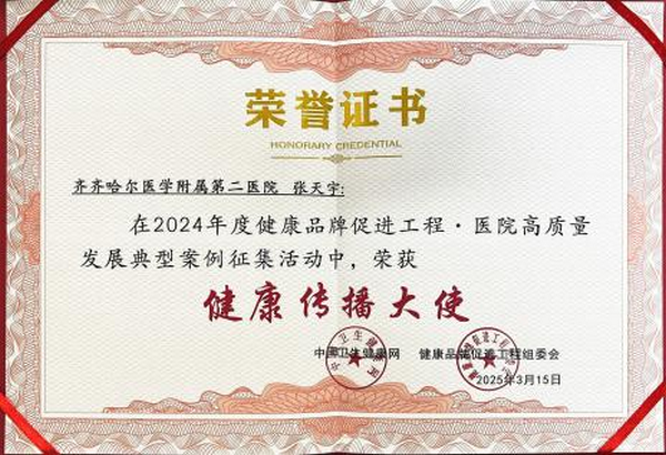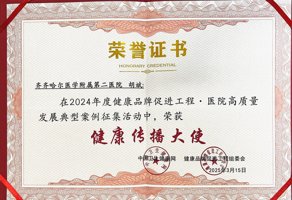康复医学科副主任胡斌、影像中心张天宇两位同志在健康传播领域积极贡献,获评 “健康传播大使”,展现了医院人才在健康科普事业中的先锋力量。