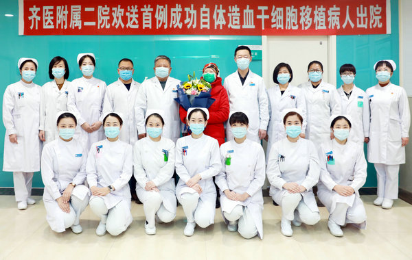 齐医附属二院领导及血液内科医护人员欢送首例成功自体造血干细胞移植病人王丽芳出院