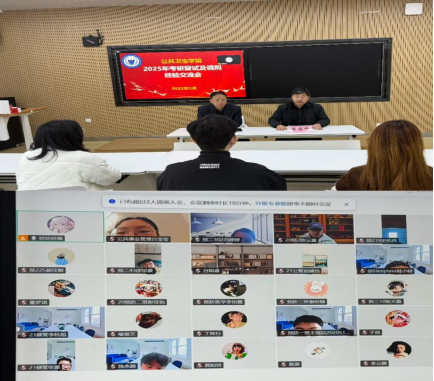 为了助力公共卫生学院考研学生成功上岸,公共卫生学院于2025年3月21日下午召开了针对2025届考研毕业生的复试及调剂经验交流会,会议采用线上线下相结合的形式进行。公共卫生学院党总支书记史孝志、副书记薛海峰及2025届考研上线毕业生参加了会议。