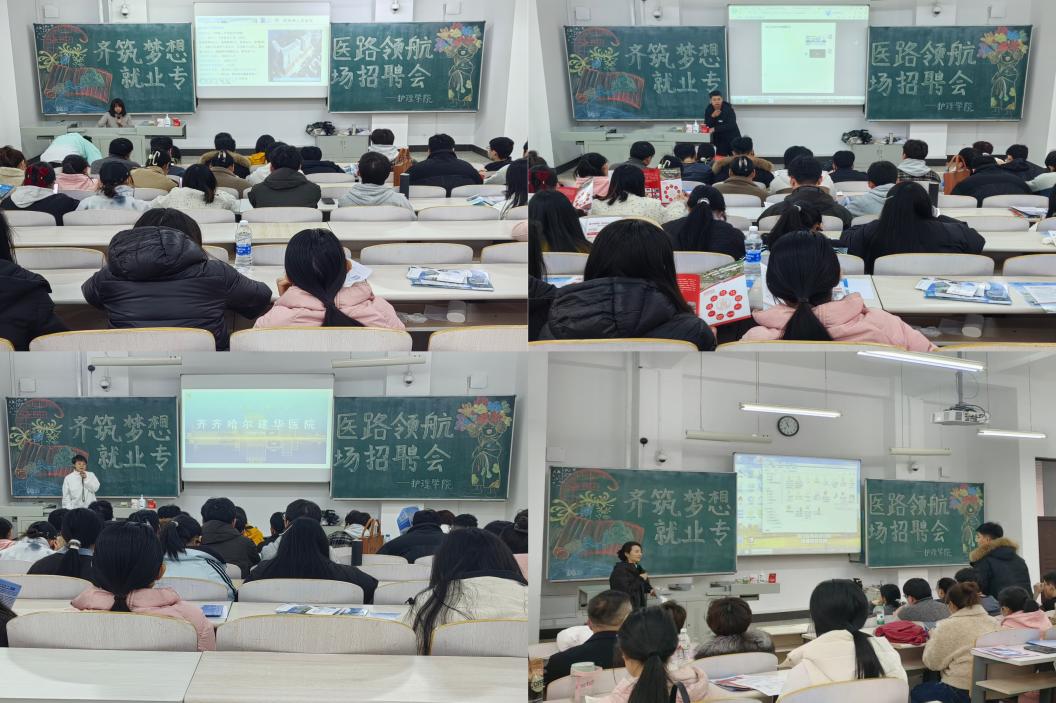 招聘会分会场“齐筑梦想,医路领航”春季就业专场招聘会于教学主楼北区104教室召开。会上,东部战区空军医院、黑龙江省民福医院、阿荣旗人民医院、齐齐哈尔市建华医院4家用人单位介绍了各自单位的企业文化、薪资待遇、未来发展以及用人需求。护理学院党总支书记李强,学生工作办公室主任、团总支书记王坤与各用人单位招聘负责人就双方供需与实际情况进行了深入交流。招聘会现场气氛热烈,毕业生积极与用人单位互动,用人单位热情地为学生解答疑问。