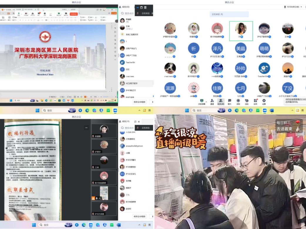 招聘会主会场气氛热烈,秩序井然。除现场招聘外,护理学院为打破时间与空间的限制,采用“线上+线下”双轨并行模式,通过开启腾讯会议和直播带岗等模式,带领毕业生“云参与”招聘会现场,以“直播+宣讲+答疑”的形式,全方位展示用人单位的情况,实时解答学生提出的问题。直播期间,护理学院特邀深圳市龙岗区第三人民医院招聘负责人黄芳芳出席会议,线上参会学生共计50余人。
