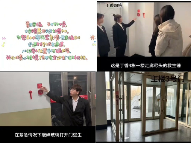 同时,拍摄安全逃生门指引视频,介绍逃生门位置、标识及使用方法,助力学生紧急避险。