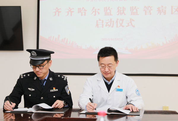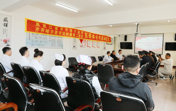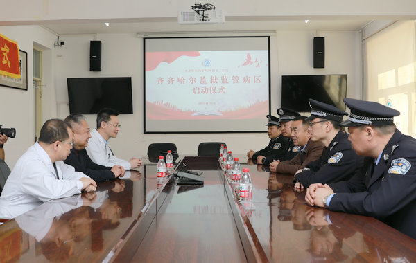 4月2日上午,黑龙江省齐齐哈尔监狱党委委员、副监狱长徐伟年、张鹏一行6人莅临齐医附属二院,双方单位在精神卫生中心二楼举行医联体合作启动仪式,通过成立监管病区、开通服刑人员就医“绿色通道”等举措,深化医疗协作,共同提升监狱医疗保障能力,筑牢安全防线。启动仪式上,齐医附属二院党委书记丁国旭致辞,院长、党委副书记武立刚代表医院签约,院办、医务部、护理部、保卫科、体检科等相关科室负责人参会。