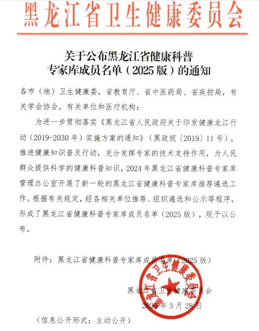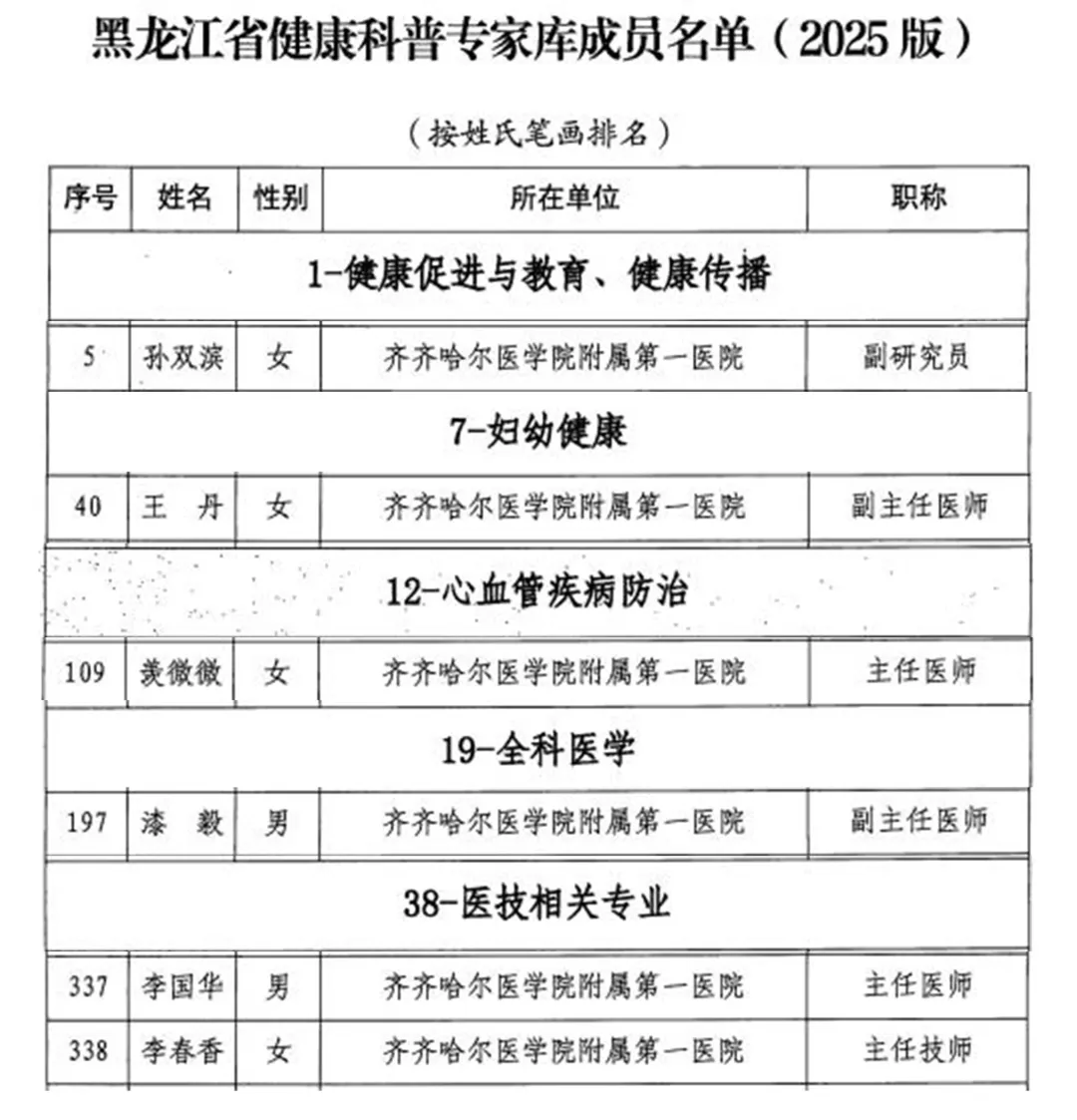 近日,黑龙江省卫健委发布黑龙江省健康科普专家库成员名单(2025版),齐齐哈尔医学院附属第一医院李国华、李春香、王丹、羡微微、漆毅、孙双滨经遴选成为黑龙江省健康科普专家库成员(2025版)。